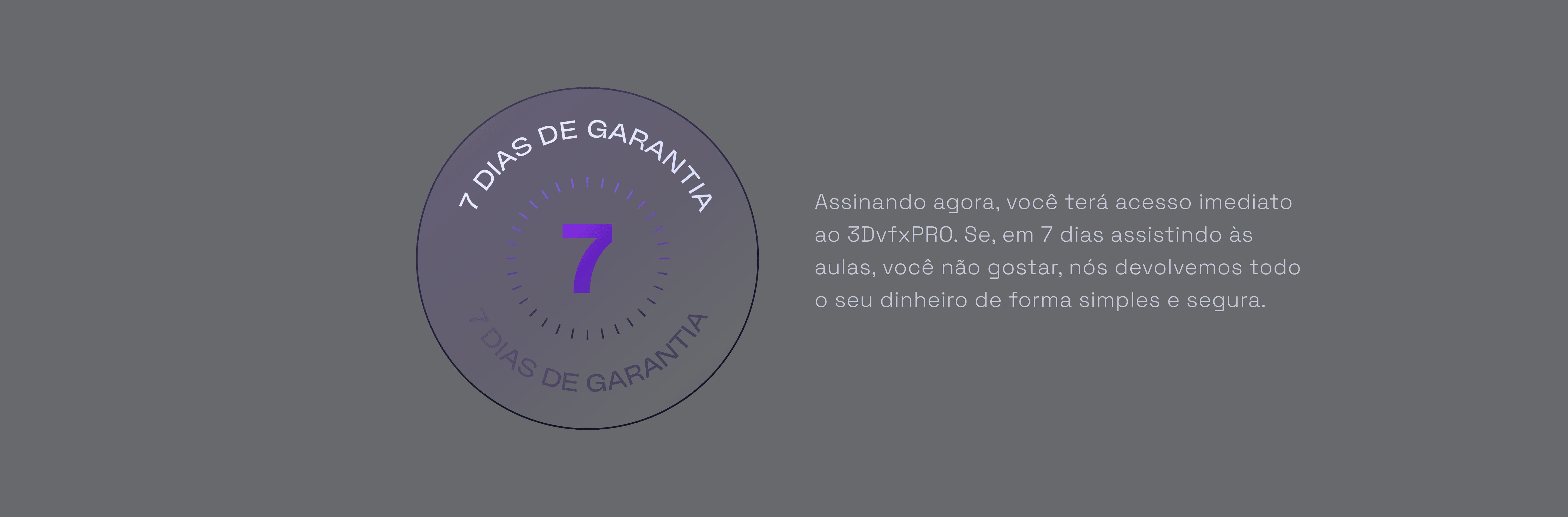 Assinando agora, você terá acesso imediato ao 3DvfxPRO . Se, em 7 dias assistindo às aulas, você não gostar, nós devolvemos todo o seu dinheiro de forma simples e segura.