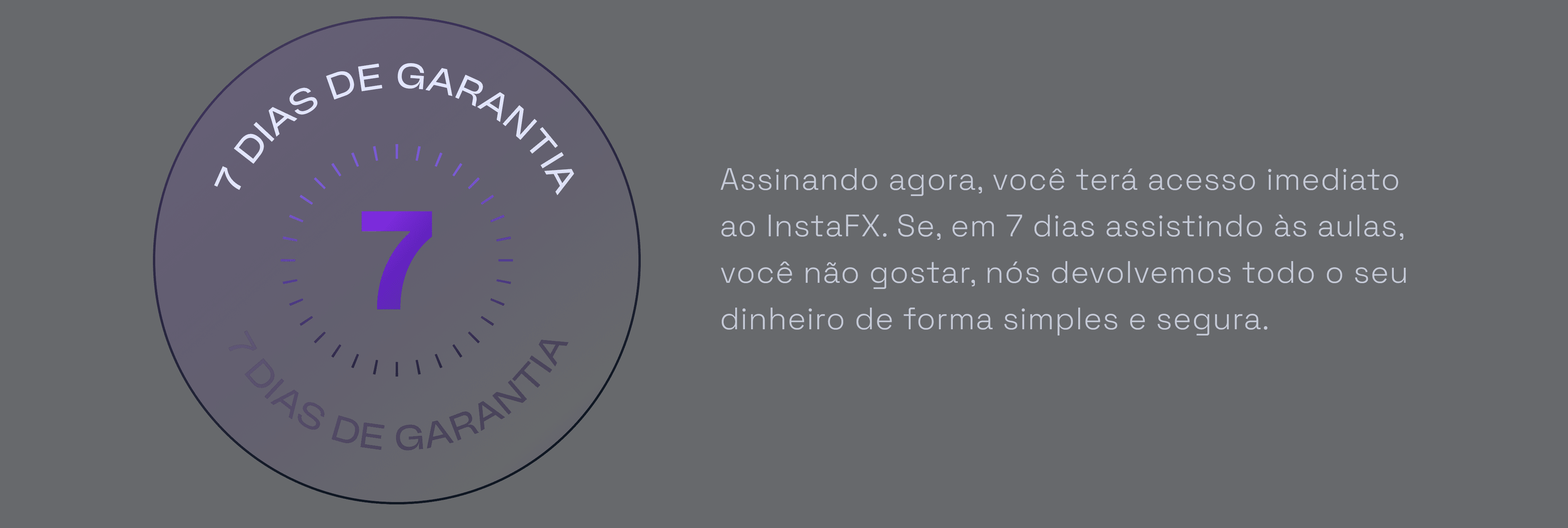 Assinando agora, você terá acesso imediato ao InstaFX. Se, em 7 dias assistindo às aulas, você não gostar, nós devolvemos todo o seu dinheiro de forma simples e segura.