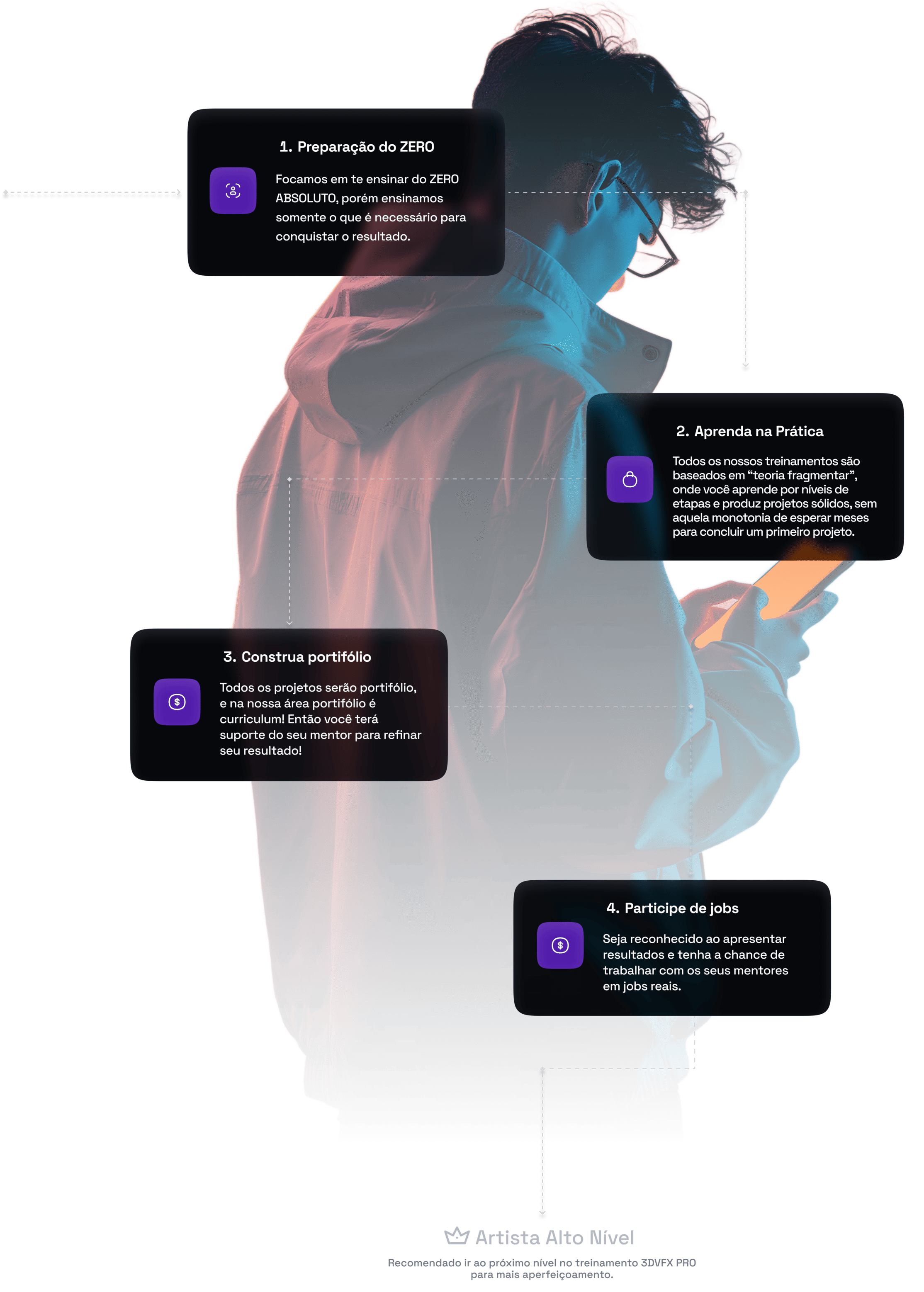 O curso 3DVFX PRO foi criado para atender pessoas que querem aprender do zero absoluto até o nível sênior em 3D e VFX. O curso é diferenciado pelo fato de que o primeiro módulo não foca apenas em 3D, mas em direção de arte e direção criativa.